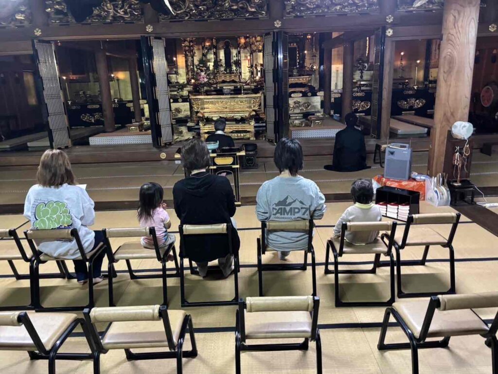 毎朝午前7時半より、お経があがります。あっくんのお嫁ちゃんは、毎朝お経をいただき手を合わせながらも、中座して出勤します。お休みの時は、みんなで『正信偈』と勤めます。前日から来ていた外孫も、手を合わせてくれます。